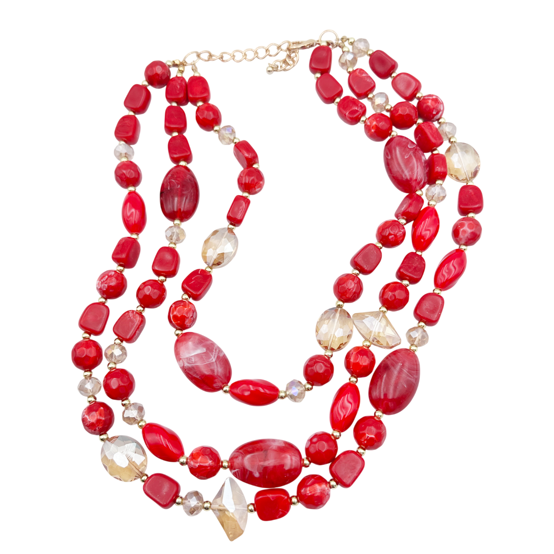 Un colier statement deosebit, realizat în nuanțe vibrante de roșu, care exprimă pasiune, eleganță și feminitate. Combină armonios mărgele de diferite forme și dimensiuni cu elemente transparente și accente aurii, oferind un efect vizual rafinat.