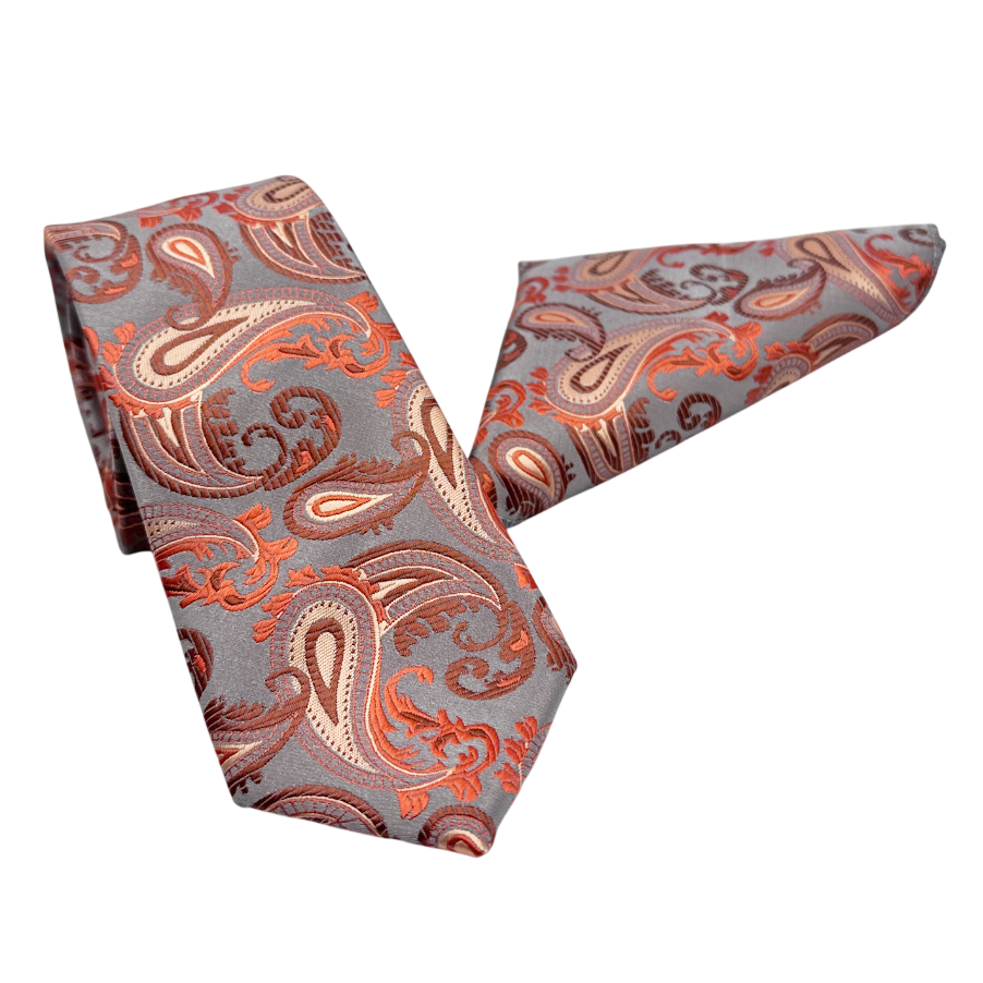 Set cu cravata si batista CHRIS, Model Paisley, Gri/ Ruginiu