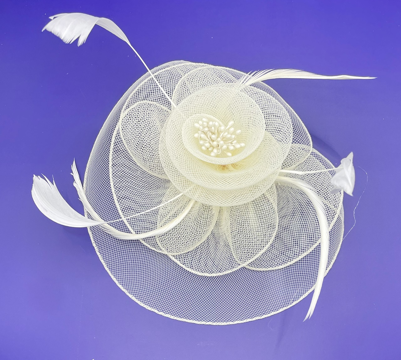 Voaleta crem - Fascinator CARMELLA, în formă de floare, este decorată cu pene, ceea ce ii confera eleganta si rafinament.