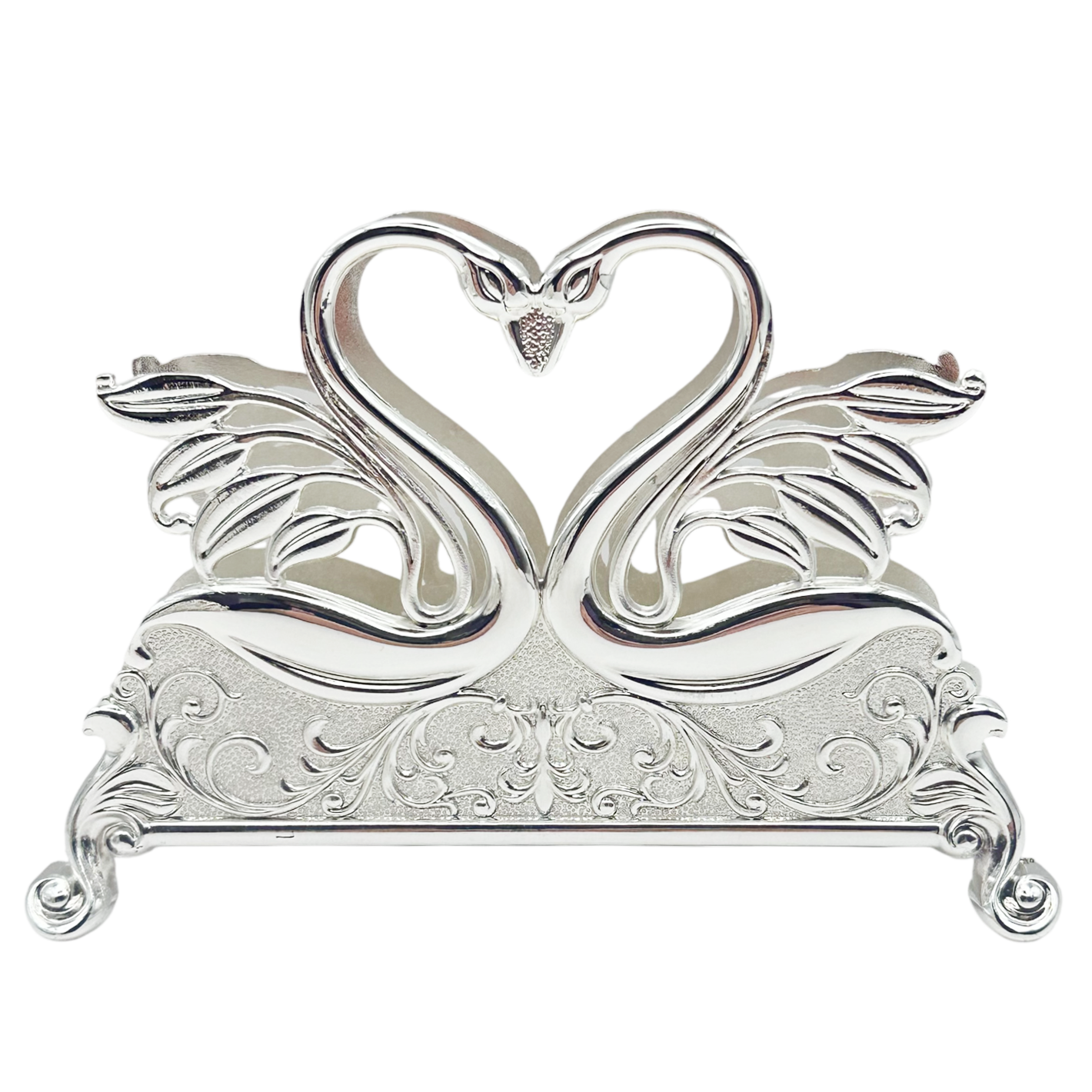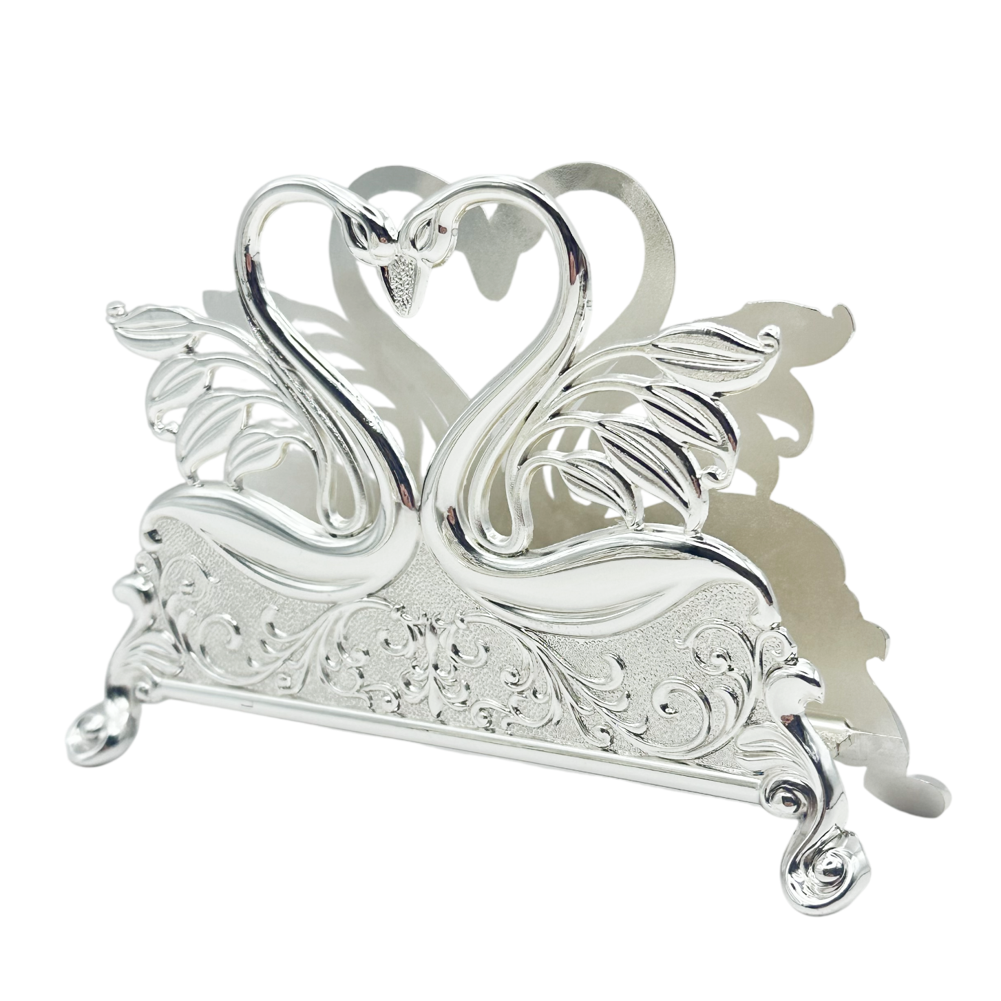 Suport elegant pentru șervețele, cu design în formă de lebede și finisaj argintat.