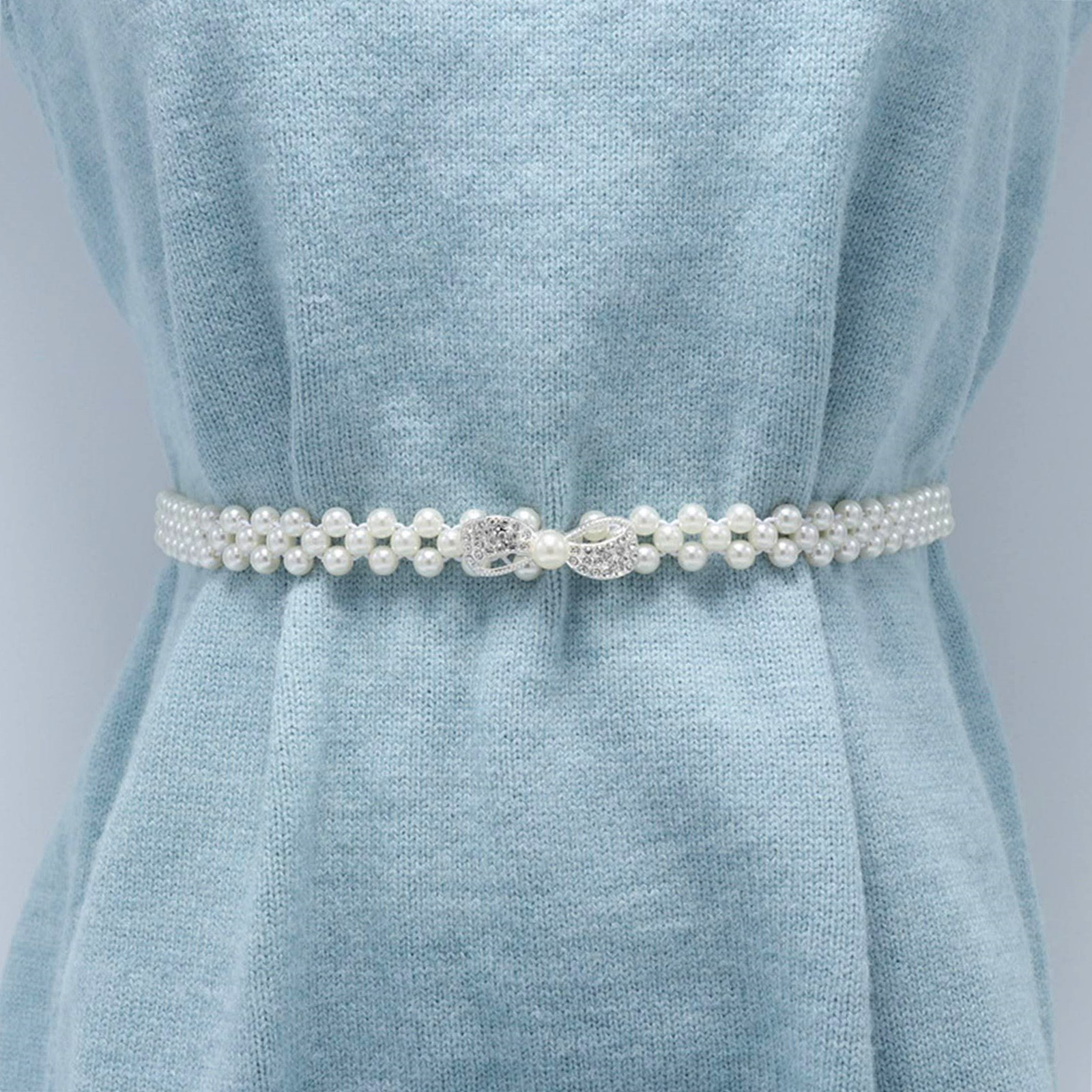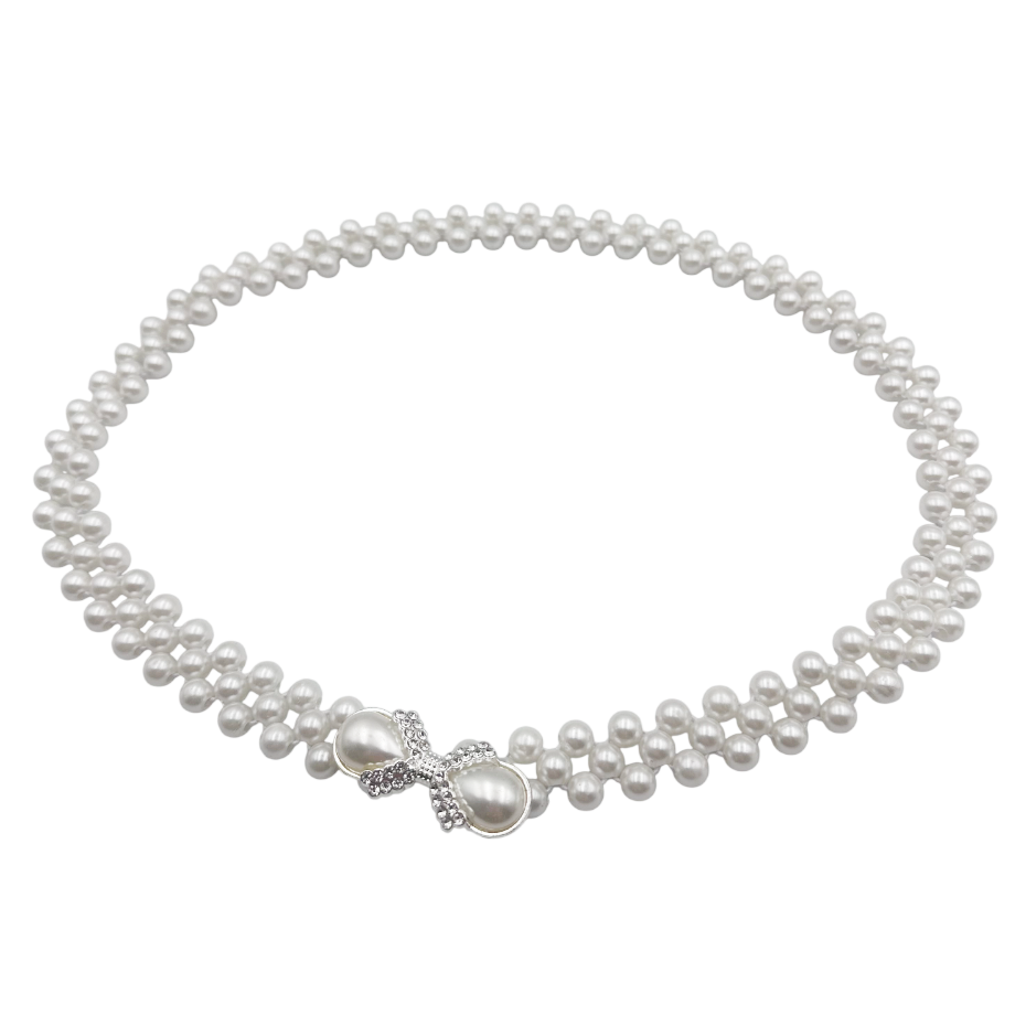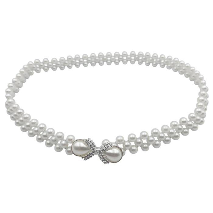 Curea elegantă cu perluțe decorative, realizată pe structură flexibilă, ideală pentru a evidenția talia și a completa ținute feminine.