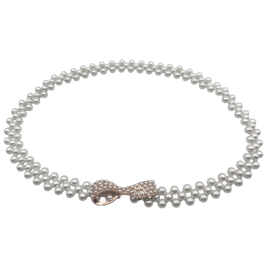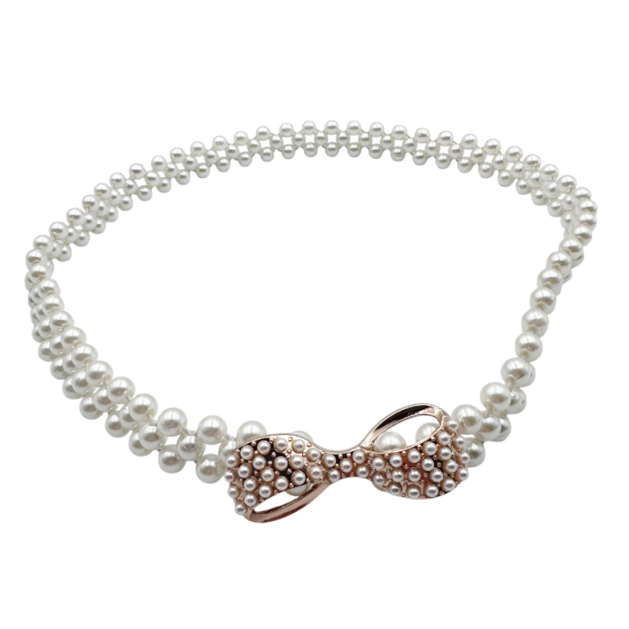 Curea elegantă cu perluțe decorative, realizată pe structură flexibilă, ideală pentru a evidenția talia și a completa ținute feminine.