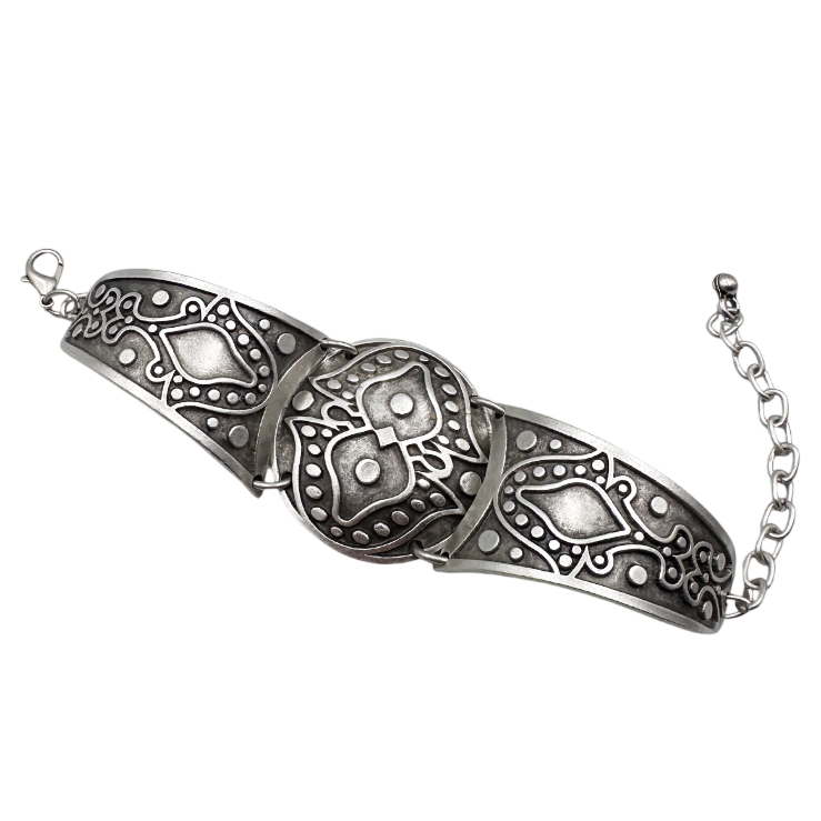 Brățară decorativă realizată din zamac, formată din două panouri laterale curbate și un element central rotund, decorate cu motive geometrice în relief.