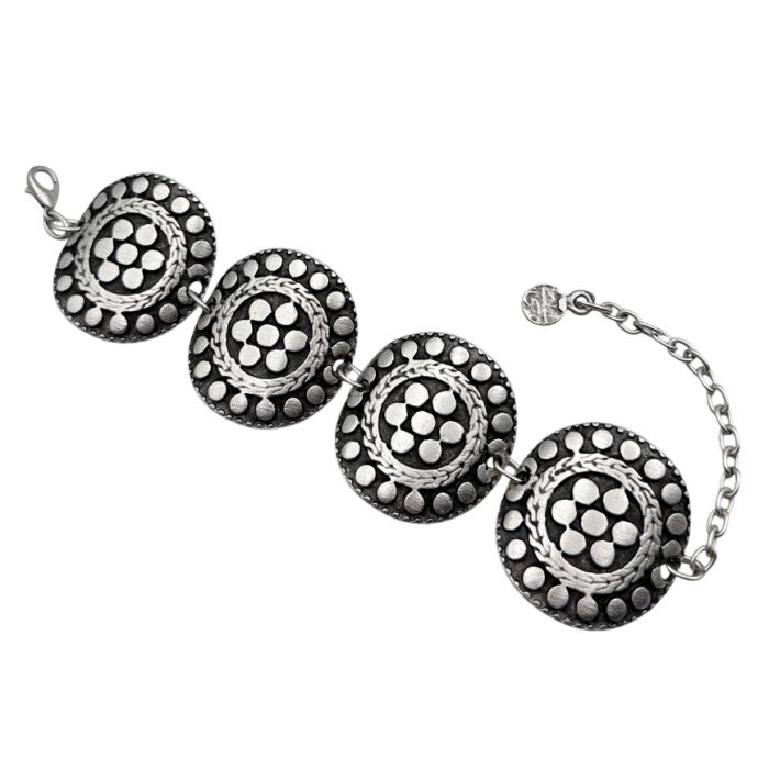 Brățară din zamac, formată din elemente circulare cu motive ornamentale în relief.