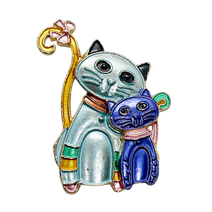 Broșă adorabilă cu două pisici stilizate, realizată în nuanțe de albastru, bleu și auriu.