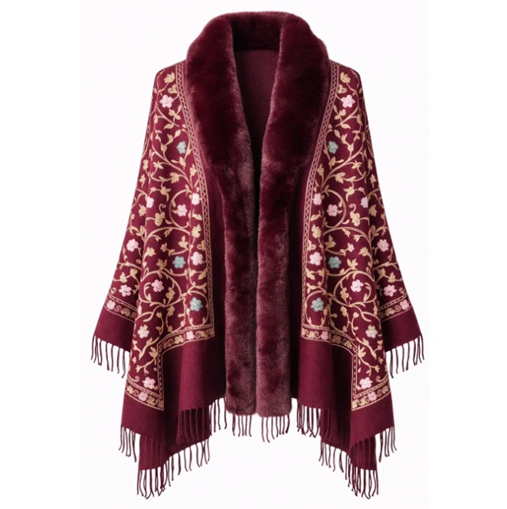 Esarfa tip Poncho cu blanita si broderie Cashmere DAPHNE, Burgundy