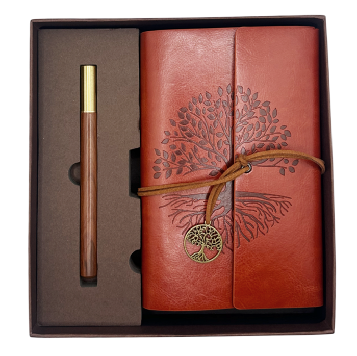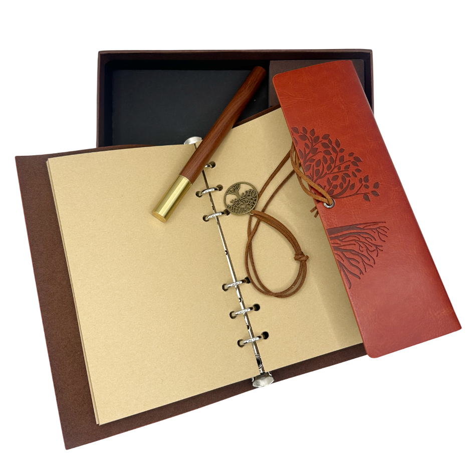 Set elegant compus din agendă tip jurnal cu file natur (kraft), neliniate (veline) și pix asortat, ambalate într-o cutie premium – ideal pentru cadou.