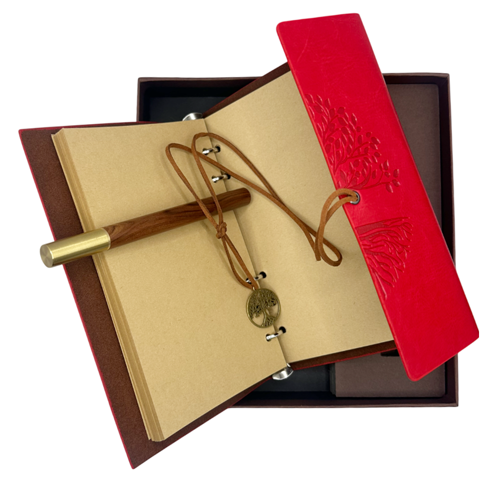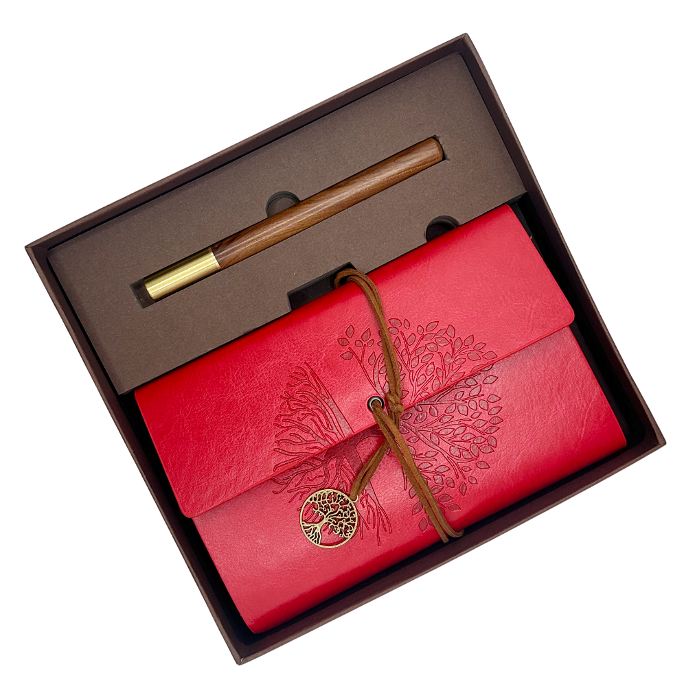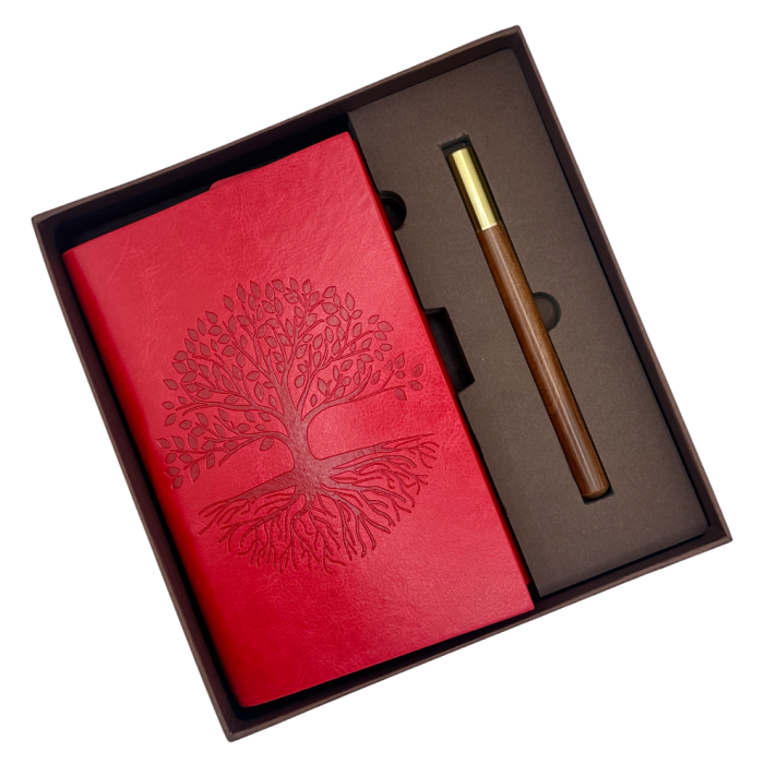 Agenda are copertă rosie cu model embosat „Arborele Vieții”, simbol al echilibrului și creșterii. Se închide cu șnur decorativ și medalion metalic cu același simbol.