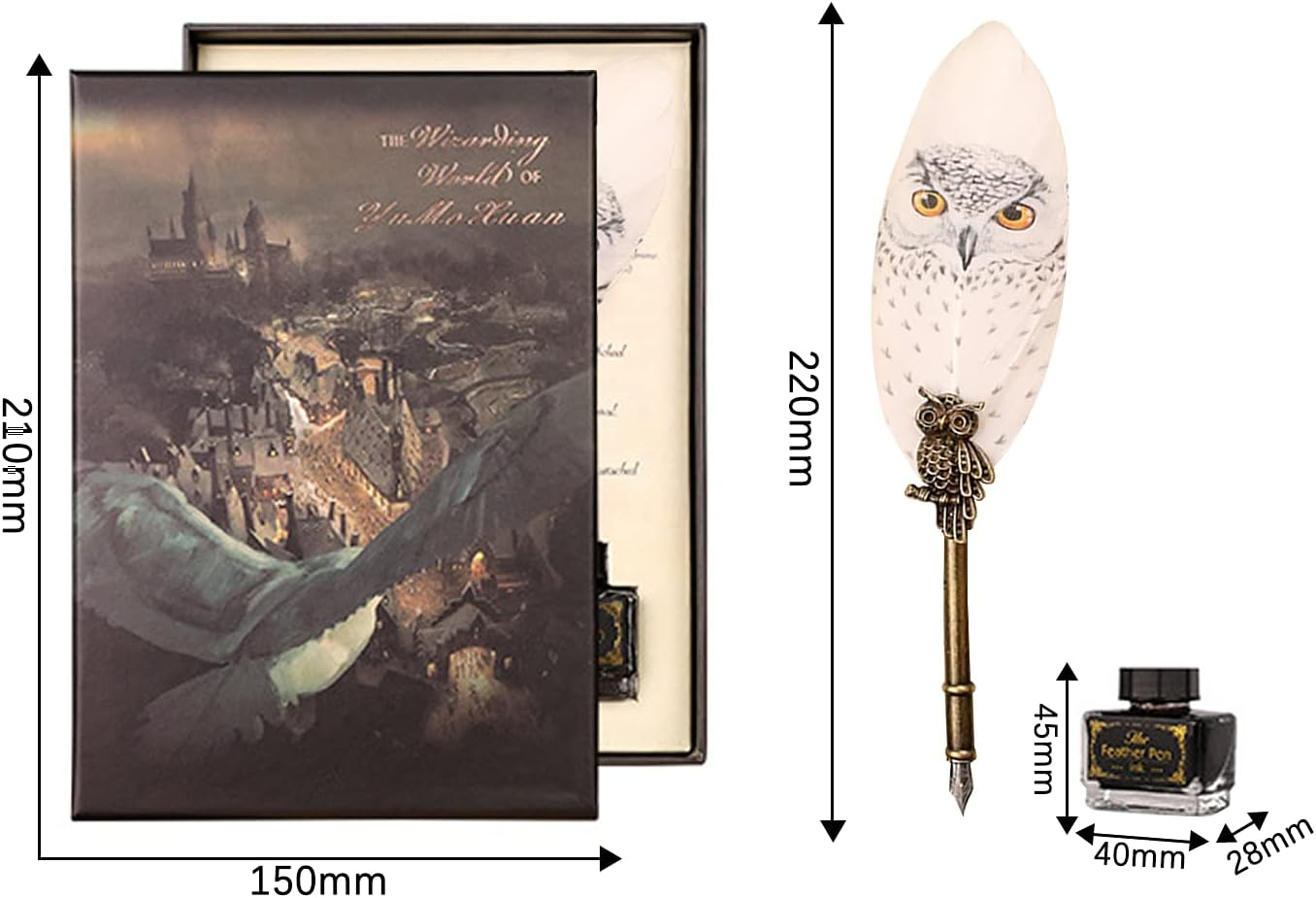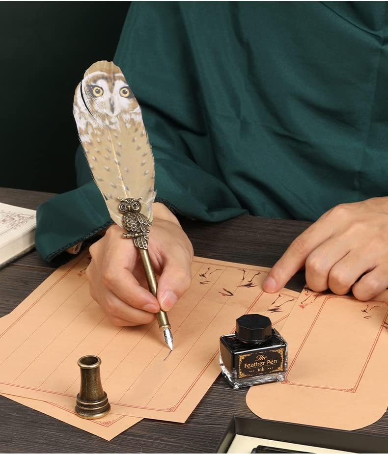 Un set rafinat pentru iubitorii universului magic: stilou cu pană aurie decorată cu bufniță, suport metalic antichizat și sticluță cu cerneală.