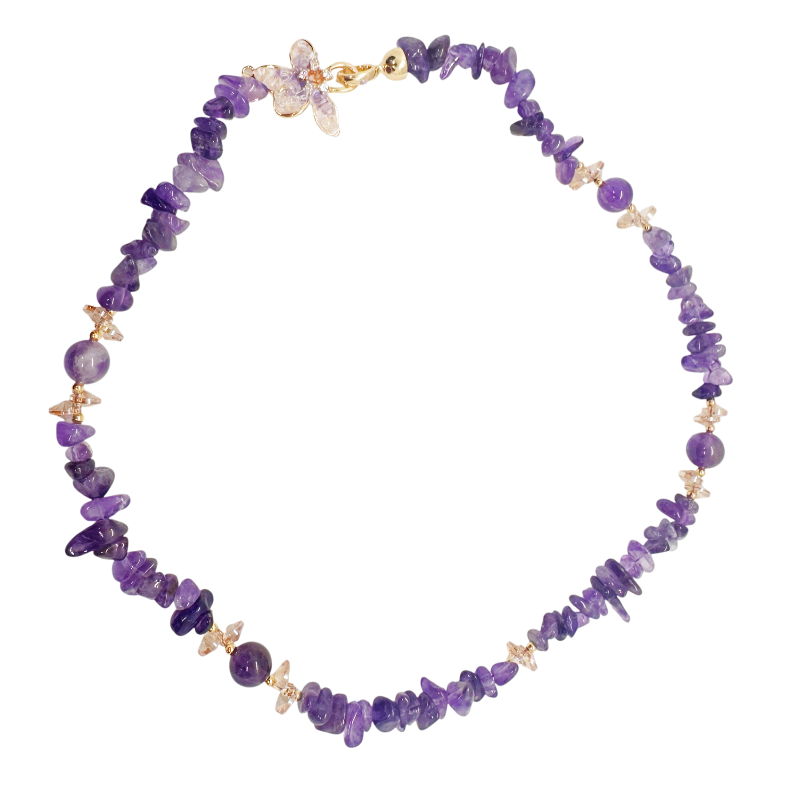 Mărgelele din ametist, în nuanțe de mov, sunt completate de un pandantiv delicat în formă de fluture, simbol al transformării și feminității. Accentele aurii si cristalele transparente adaugă un plus de strălucire și eleganță.