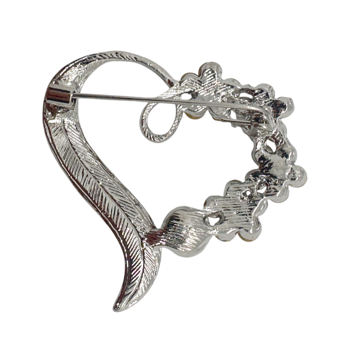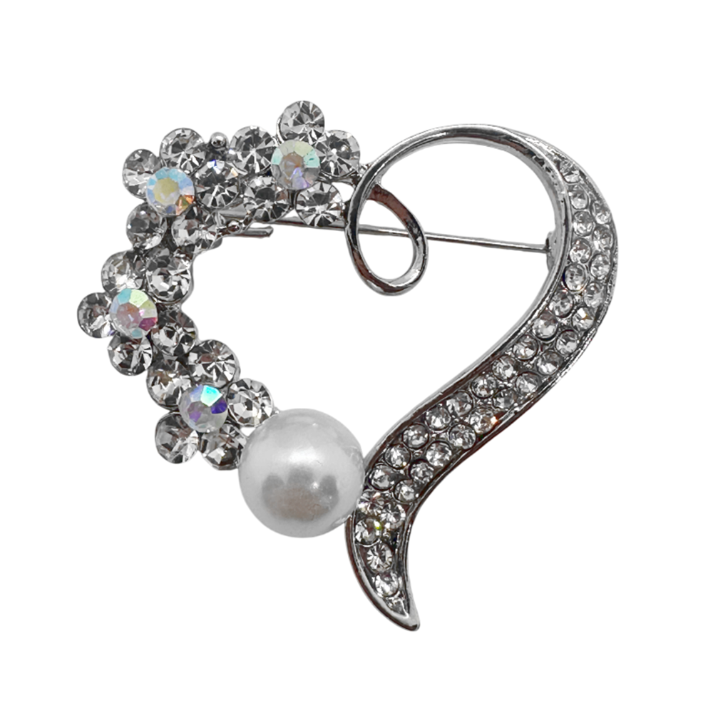 Broșă rafinată inima în nuanță argintie, decorată cu cristale strălucitoare și perlă albă