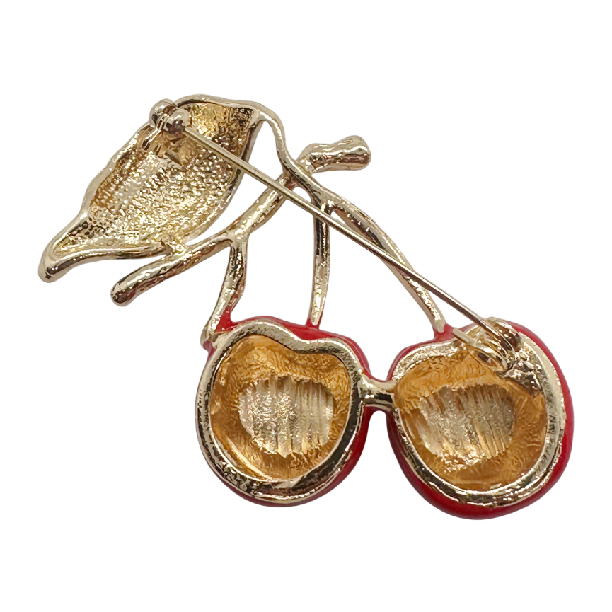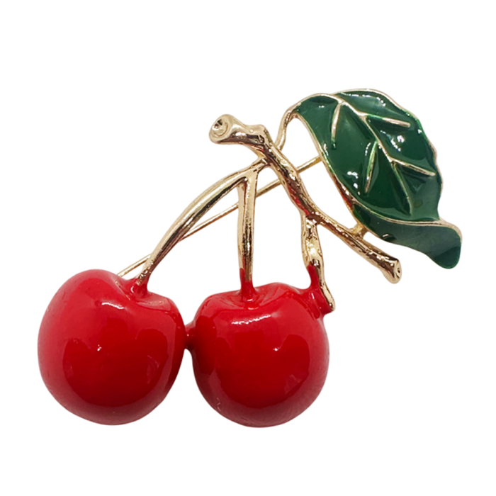 Această broșă în formă de cireșe aduce un plus de culoare și bună dispoziție oricărei ținute.