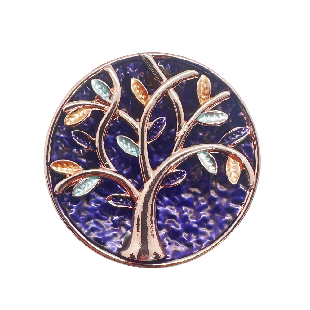 Această brosă rotundă impresionează prin designul simbolic al Copacului Vieții, redat în tonuri armonioase de mov inchis si auriu. Fundalul texturat, cu efect sidefat, pune în valoare trunchiul auriu și frunzele contrastante, creând un accesoriu rafinat și plin de semnificație.
