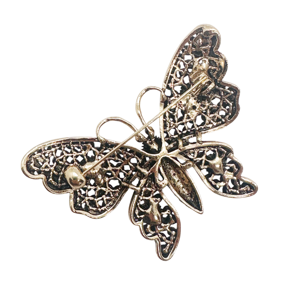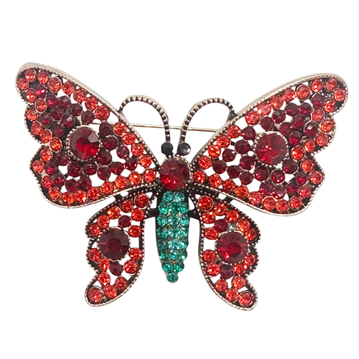 Această broșă în formă de fluture impresionează prin combinația îndrăzneață de roșu rubiniu și accente verzi vibrante, care îi oferă un contrast elegant și sofisticat. Aripile sunt bogat decorate cu cristale strălucitoare în diferite dimensiuni, ce captează lumina din orice unghi.