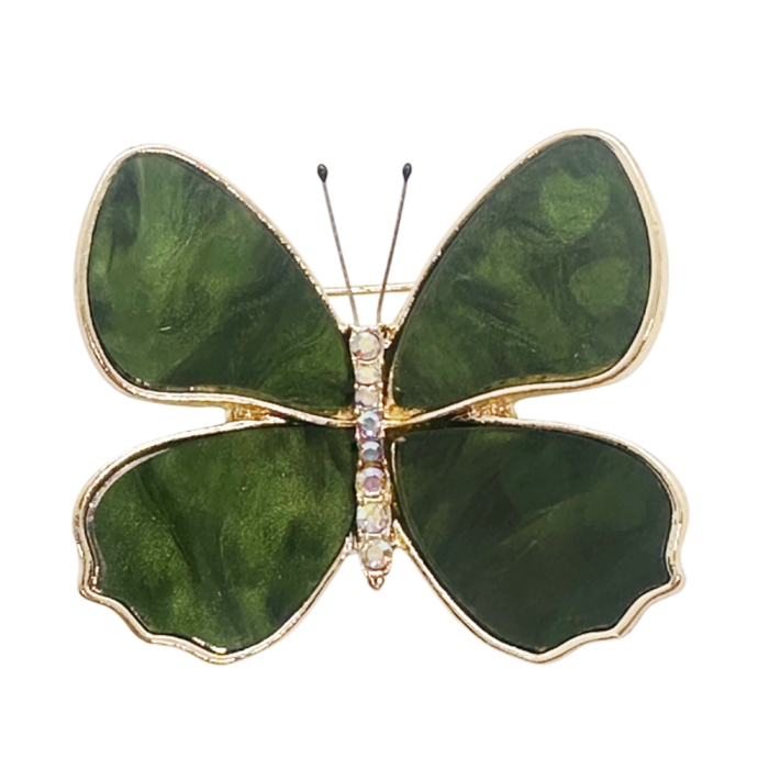 Broșă elegantă pentru femei, în formă de fluture, cu aripi verzi sidefate și contur auriu delicat, decorată cu cristale strălucitoare.