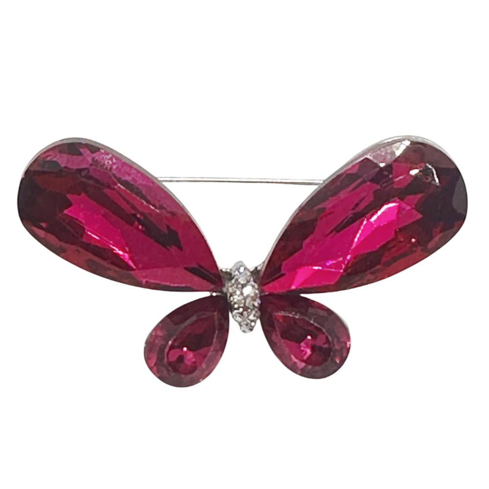 Broșă statement în formă de fluture, cu cristale mari fucsia și detaliu central strălucitor.