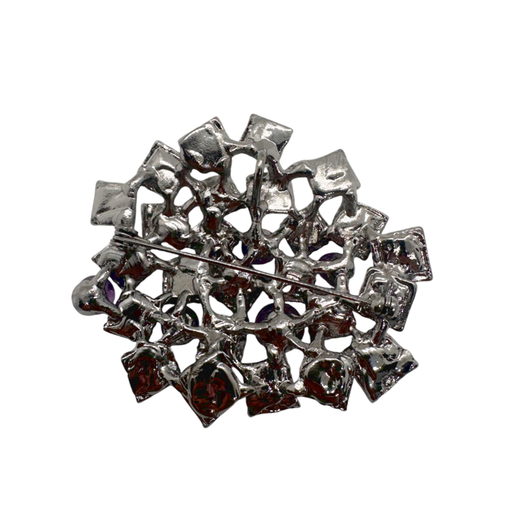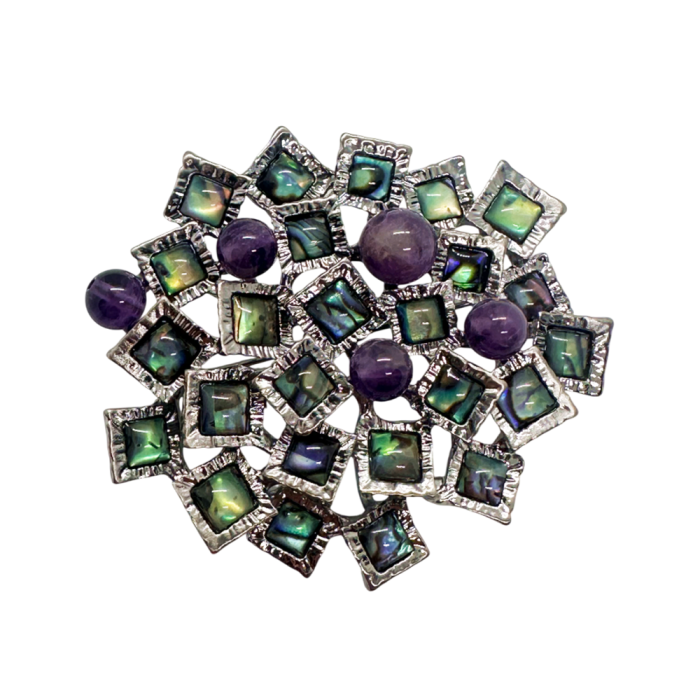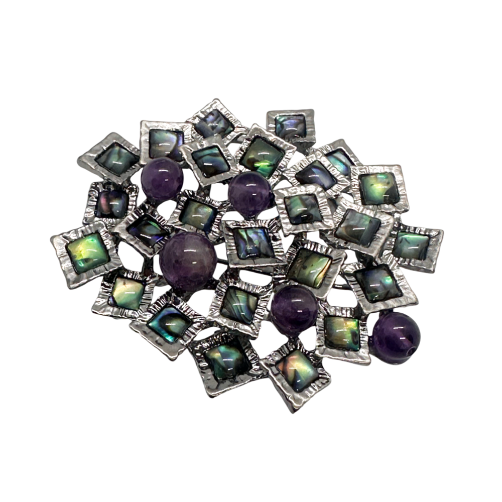 Această piesă versatilă poate fi purtată atât ca broșă, cât și ca pandantiv, fiind realizată într-un design complex, tip mozaic, cu inserții de paua shell si ametist.