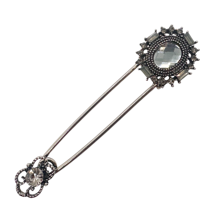 O broșă cu aer vintage și accente sofisticate, perfectă pentru iubitoarele accesoriilor elegante. Modelul tip ac de siguranță este pus în valoare de un element circular bogat ornamentat, cu un cristal central gri fumuriu fațetat, înconjurat de pietre decorative în tonuri neutre.