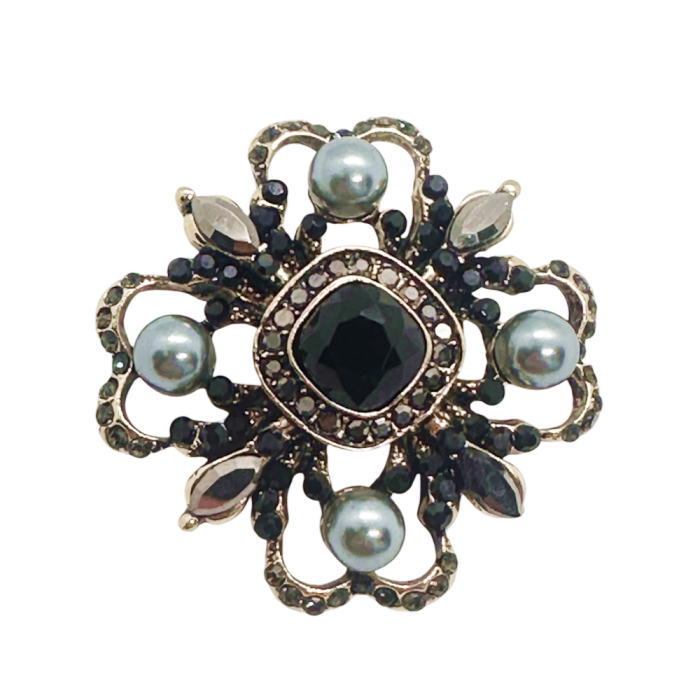 Această broșă elegantă impresionează prin designul său simetric, cu influențe clasice, având în centru un cristal negru fațetat și accente de perle delicate.