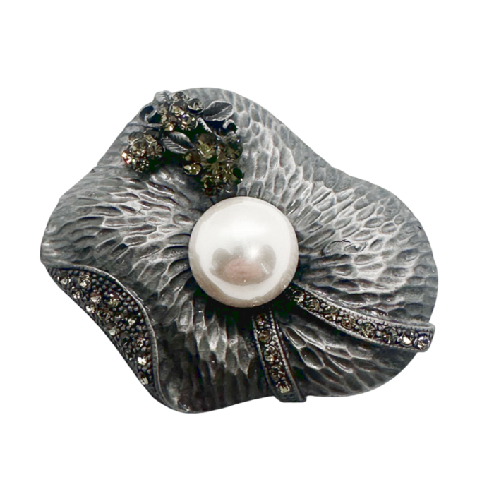 Această broșă cu inspirație vintage impresionează prin textura sa artistică și finisajul metalic patinat, ce oferă un aer sofisticat și aparte. Elementul central – o perlă elegantă – este pus în valoare de detalii cu cristale delicate și mici accente florale strălucitoare.