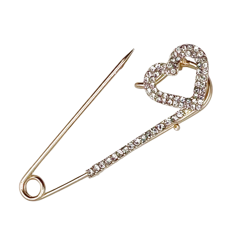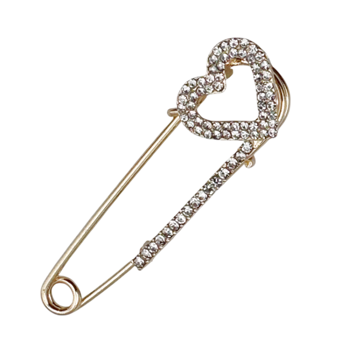 Broșă decorativă tip ac de siguranță, cu design elegant în formă de inimă, decorată cu strasuri strălucitoare și finisaj auriu.