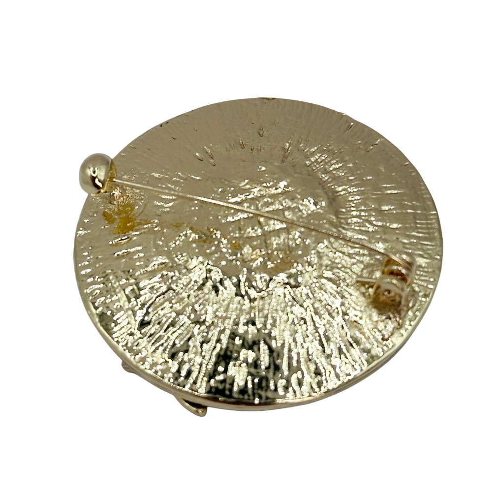 Broșă aurie „Copacul Vieții” pe fundal texturat.