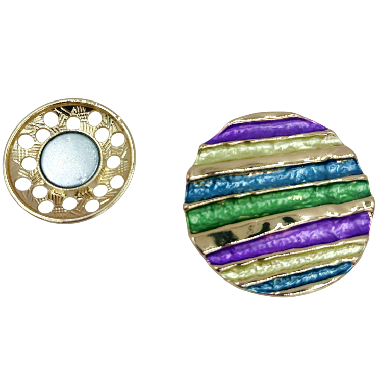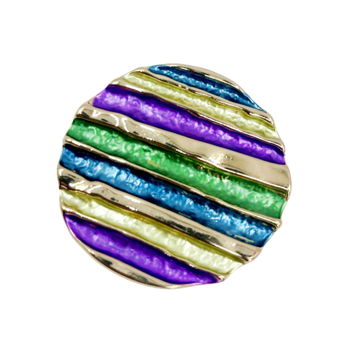 O broșă vibrantă și modernă, perfectă pentru a adăuga un accent de culoare oricărei ținute. Modelul rotund este decorat cu benzi emailate în nuanțe de verde, mov și albastru, armonios îmbinate cu finisaj auriu elegant.