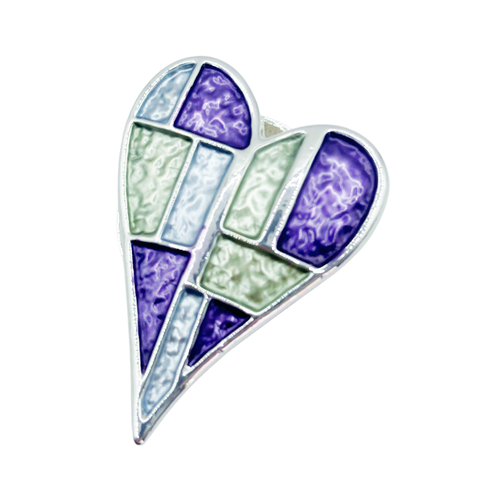 O broșă în formă de inimă, cu un design inspirat din vitraliile decorative, realizată din segmente emailate în nuanțe elegante de mov, verde și gri-albăstrui.