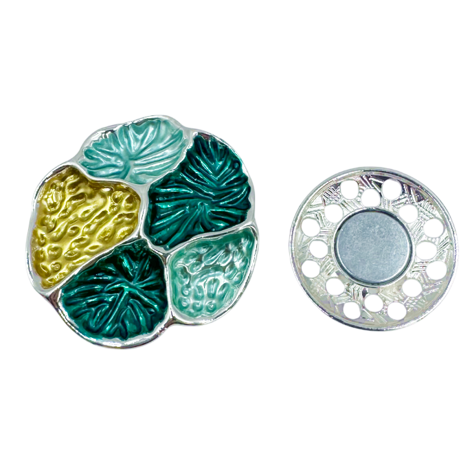 O broșă magnetică cu design inspirat din natură, decorată cu design mozaic stilizat în nuanțe armonioase de verde, turcoaz și galben.