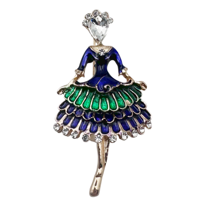 Broșă decorativă în formă de dansatoare, cu rochie multistrat în nuanțe de verde, albastru și auriu, accentuată cu cristale strălucitoare.