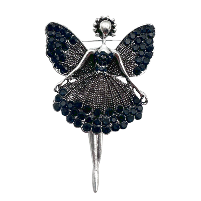 Broșă elegantă în formă de înger, decorată cu cristale strălucitoare și finisaj metalic argintiu.