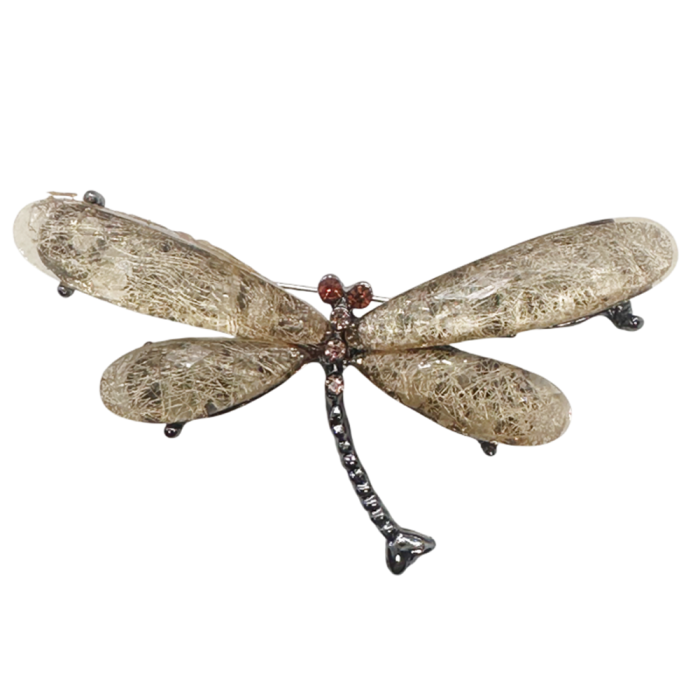 O broșă fină și expresivă, inspirată din frumusețea naturii. Modelul în formă de libelulă impresionează prin aripile sale în nuanță bej inchis, cu un efect texturat ce creează reflexii discrete și elegante.