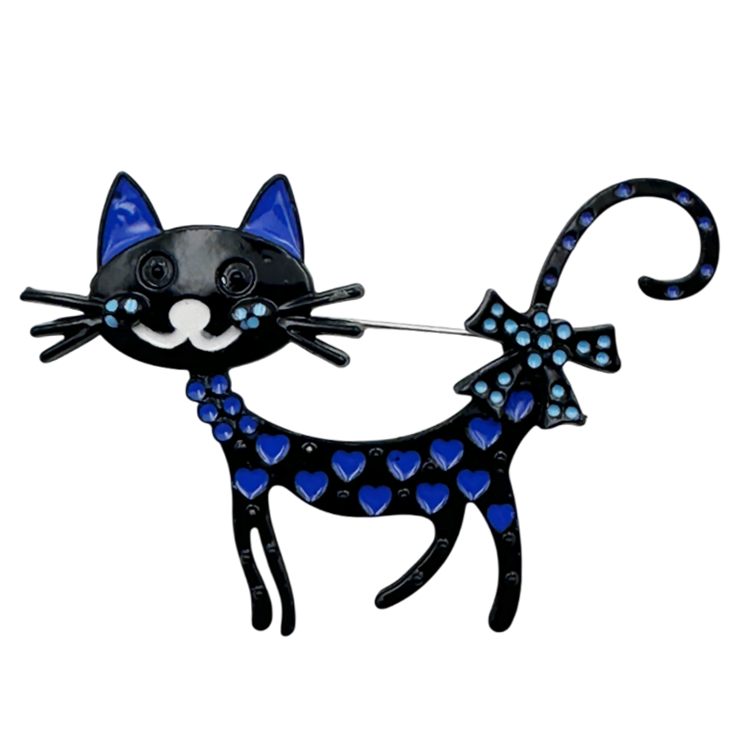 Broșă decorativă în formă de pisică stilizată, realizată în nuanțe de negru, cu detalii în formă de inimioare albastre.