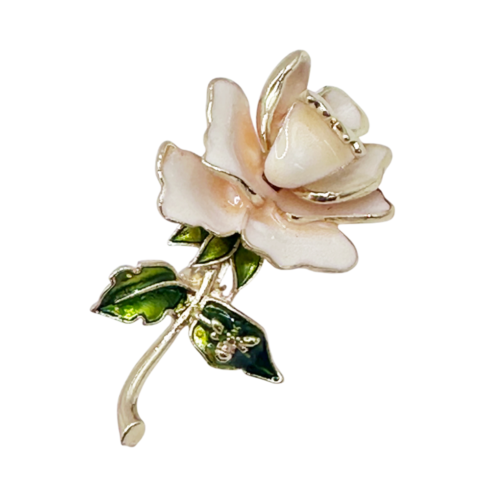 Broșă trandafir crem emailat, cu detalii fine și finisaj auriu.