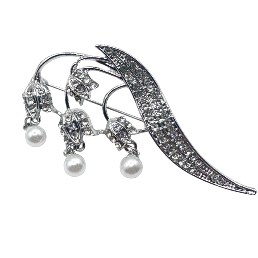 Broșă elegantă pentru femei, cu design rafinat în formă de frunza si flori de margaritar, finisaj argintiu, decorată cu cristale strălucitoare și perle delicate suspendate.