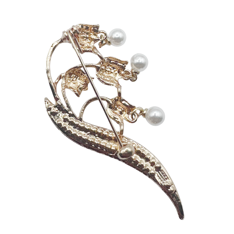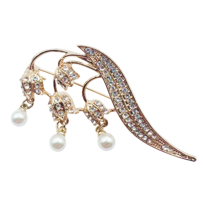 Broșă elegantă pentru femei, cu design rafinat în formă de frunza si flori de margaritar, finisaj auriu, decorată cu cristale strălucitoare și perle delicate suspendate.