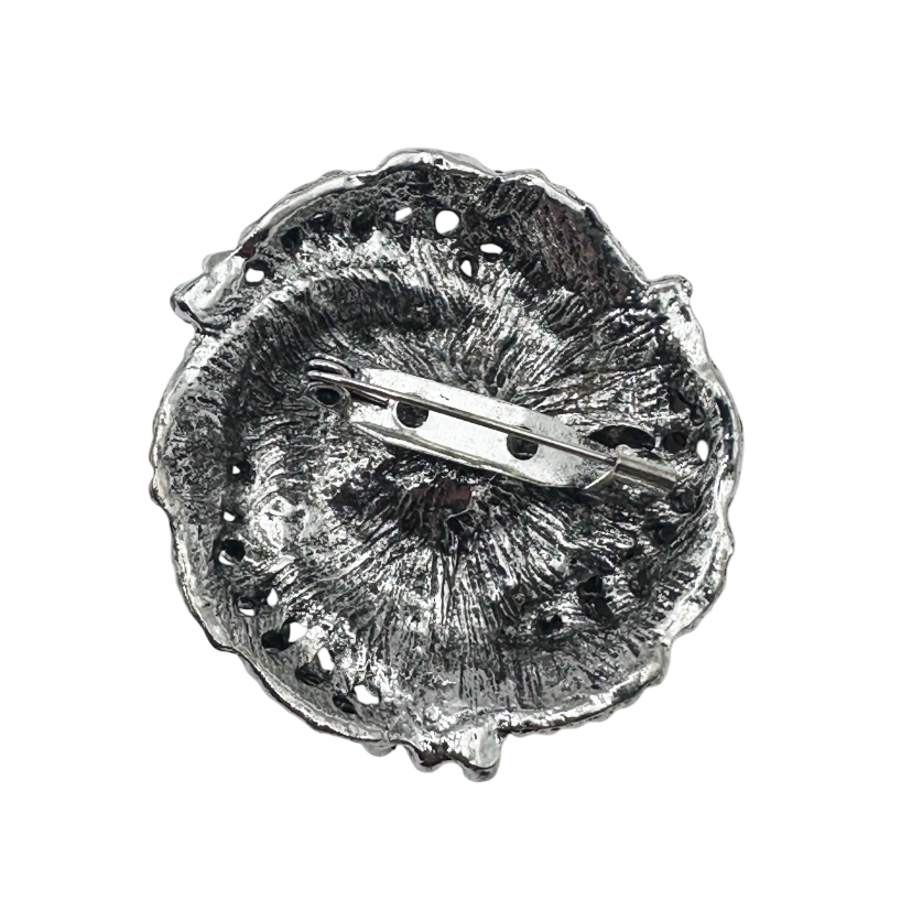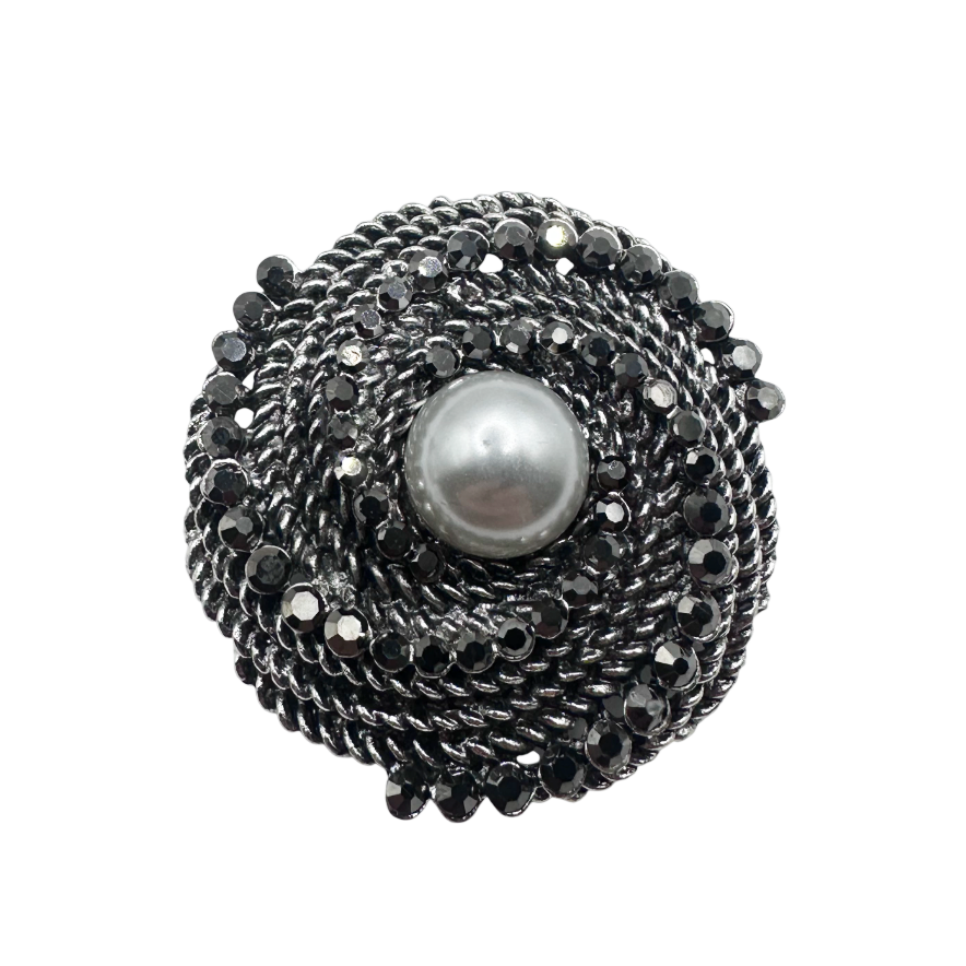 Broșă elegantă pentru femei, realizată într-un design circular, decorată cu perlă centrală-artificiala - și cristale negre strălucitoare.