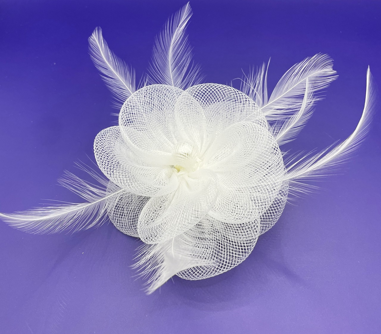 Voaleta - Fascinator alb PEARLY, în formă de floare, este decorată cu pene si perla, oferindu-i un aspect elegant si delicat.