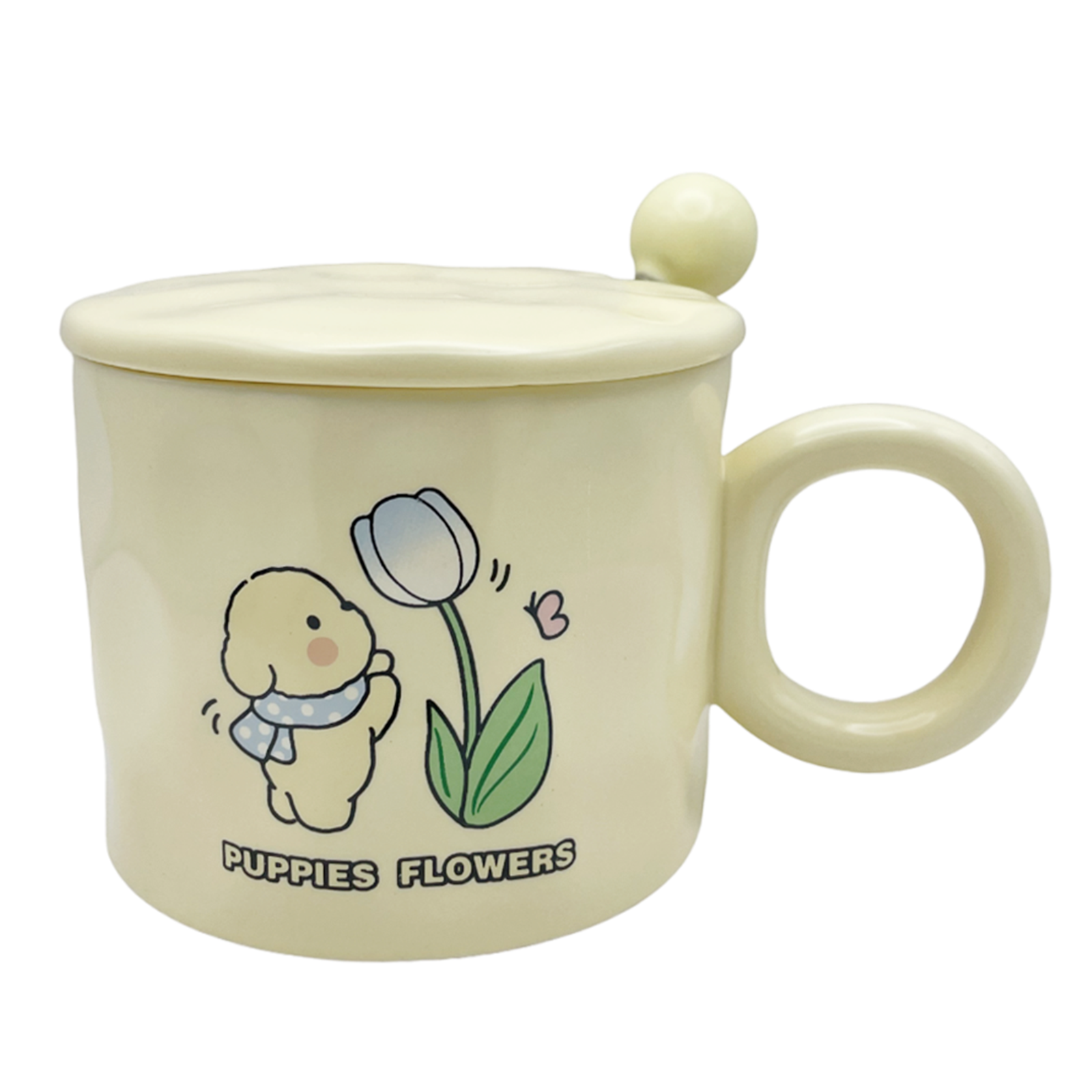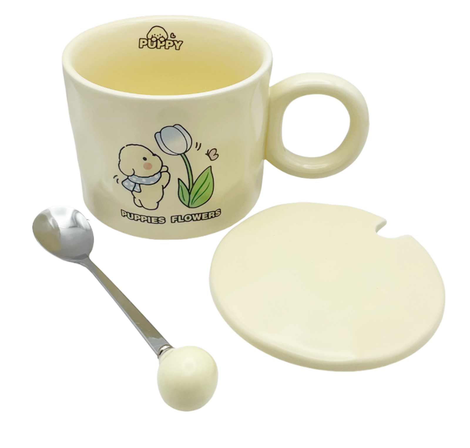 Cană ceramică, cu capac și linguriță, decorată cu cățeluș și flori