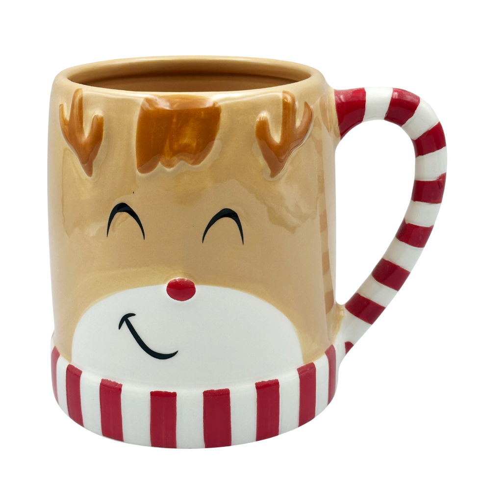 O cană adorabilă în formă de ren zâmbitor, perfectă pentru a savura ciocolată caldă, ceai sau cafea în sezonul festiv.