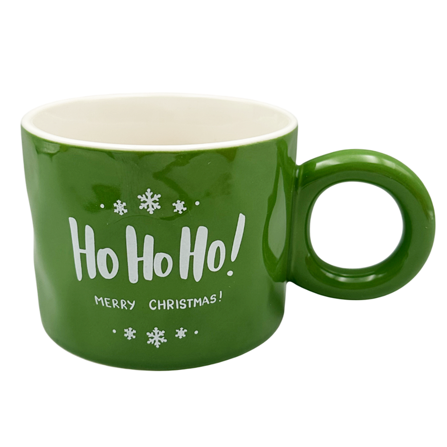 Cană decorativa de Craciun, de culoare verde, cu mesajul „HO HO HO” si o surpriza adorabila în interior: un om de zapada miniatural integrat în baza.