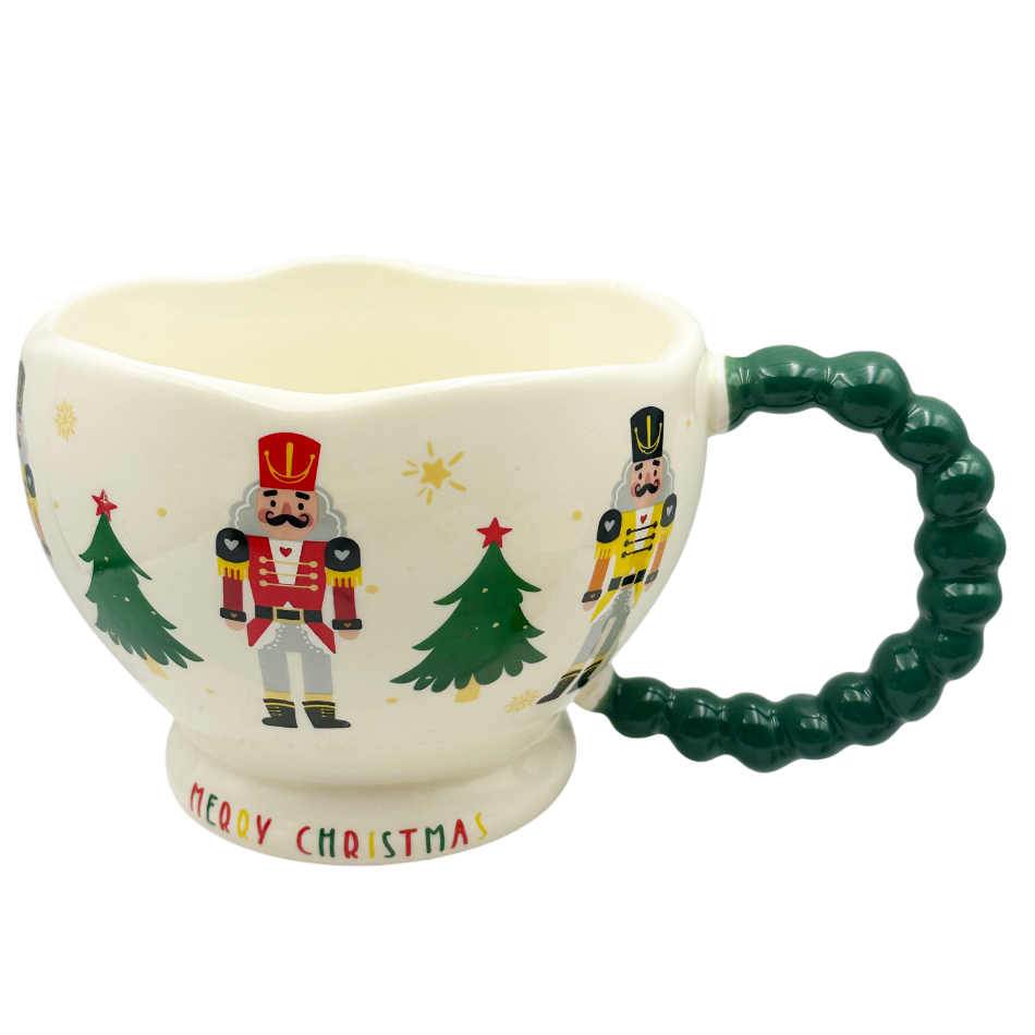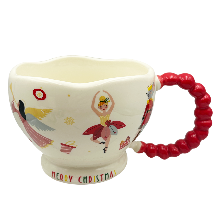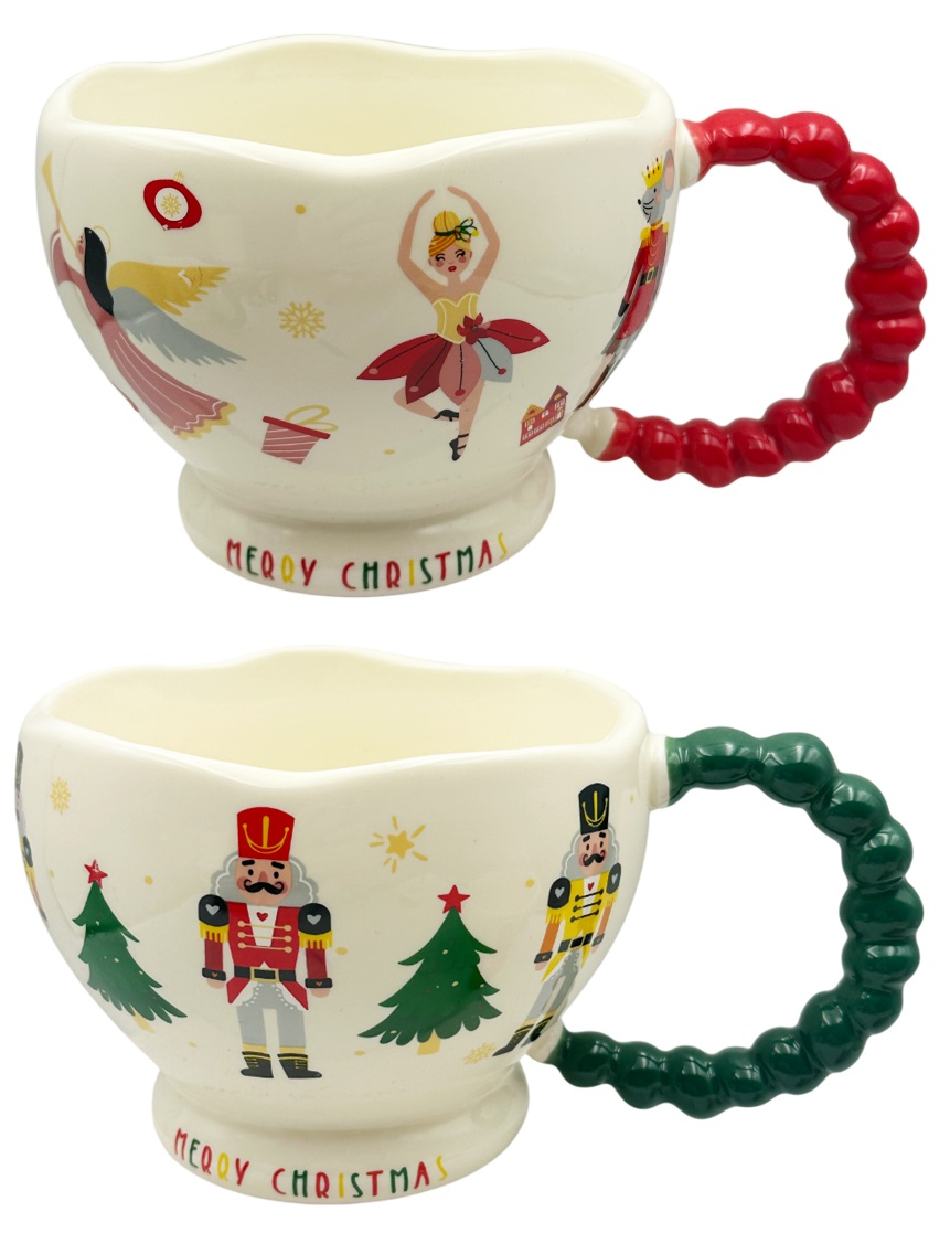 Un set magic de două căni din ceramică, decorate cu balerine grațioase și soldăței dijn baletul Spărgătorul de Nuci.