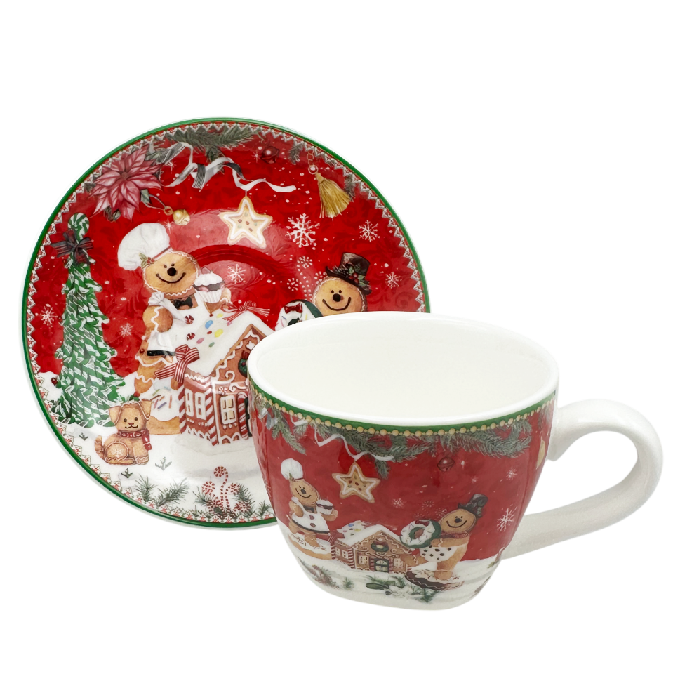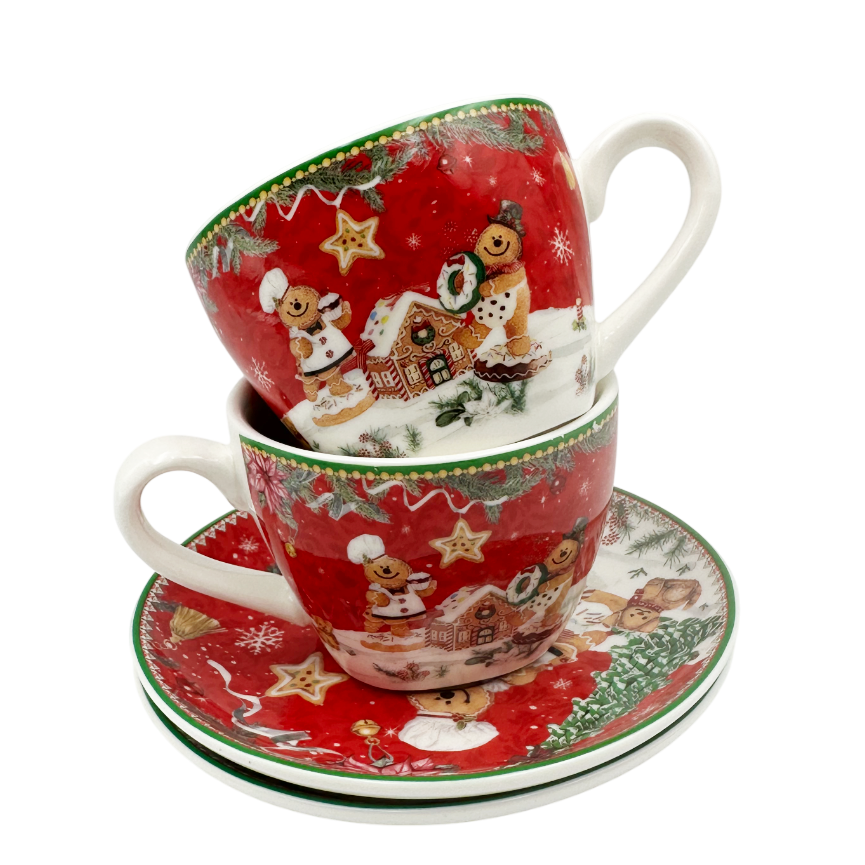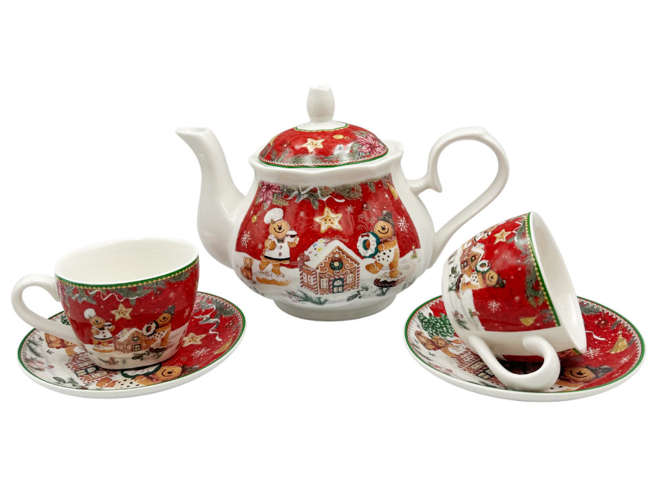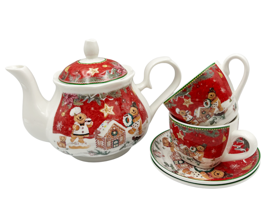 Ceainicul și cele două cești cu farfurii sunt decorate cu motive de Crăciun: turtă dulce, steluțe și ornamente de iarnă.