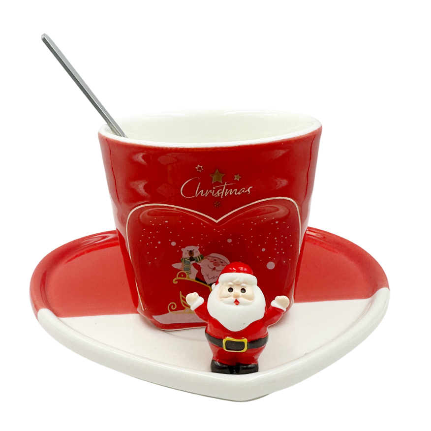 Set festiv format dintr-o ceașcă roșie decorată cu motive de Crăciun și o farfurioară în formă de inimă, completată de o figurină adorabilă cu Moș Crăciun.