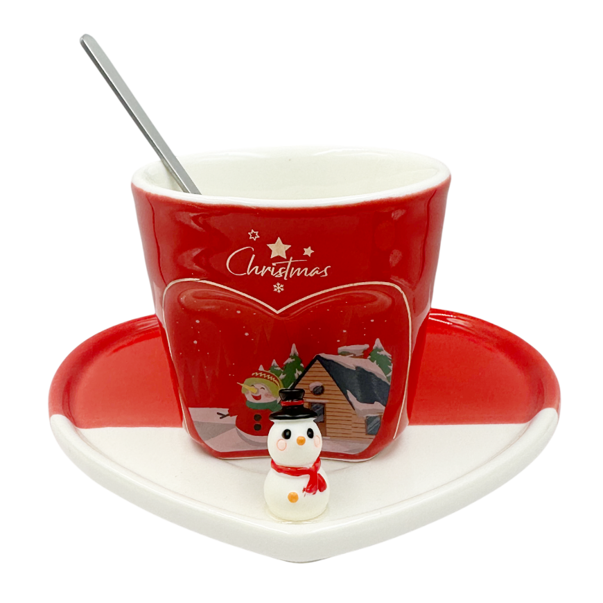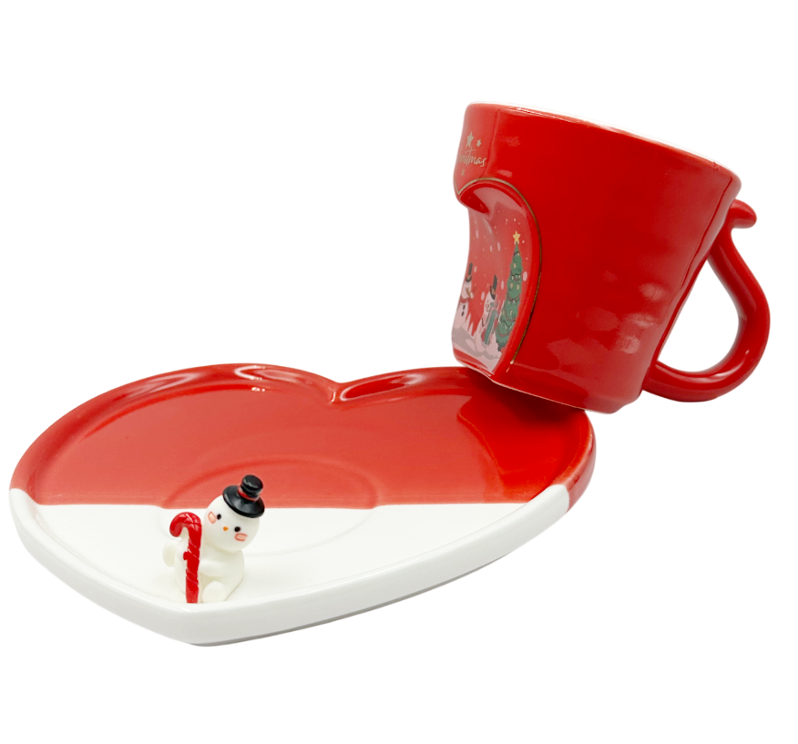 Set festiv format dintr-o ceașcă roșie decorată cu motive de Crăciun și o farfurioară în formă de inimă, completată de o figurină adorabilă cu om de zapada.