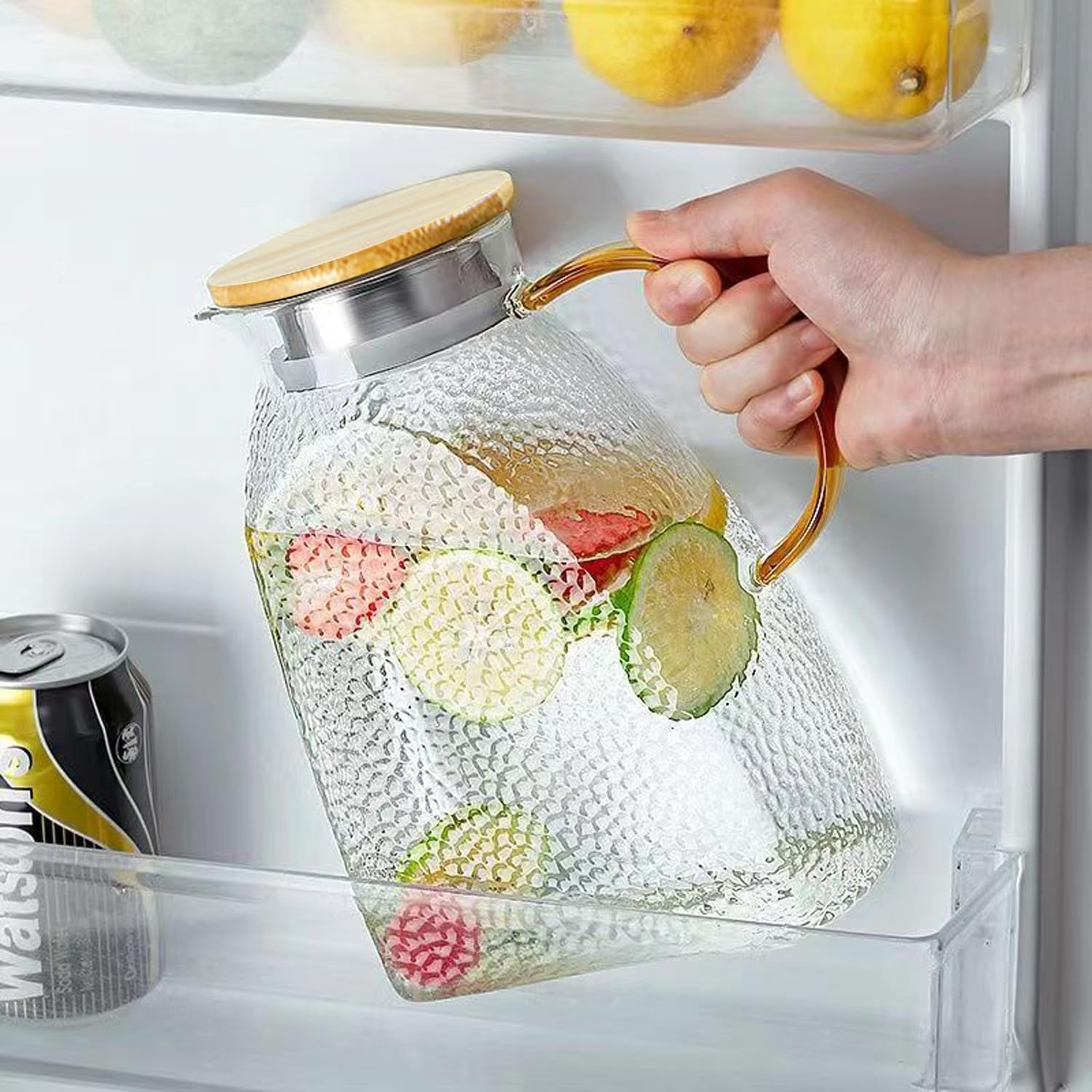 Această carafă din sticlă borosilicată este soluția perfectă pentru hidratare zilnică, fiind special concepută pentru a se încadra pe raftul ușii frigiderului. Designul său slim și practic economisește spațiu, păstrând băuturile reci mereu la îndemână.