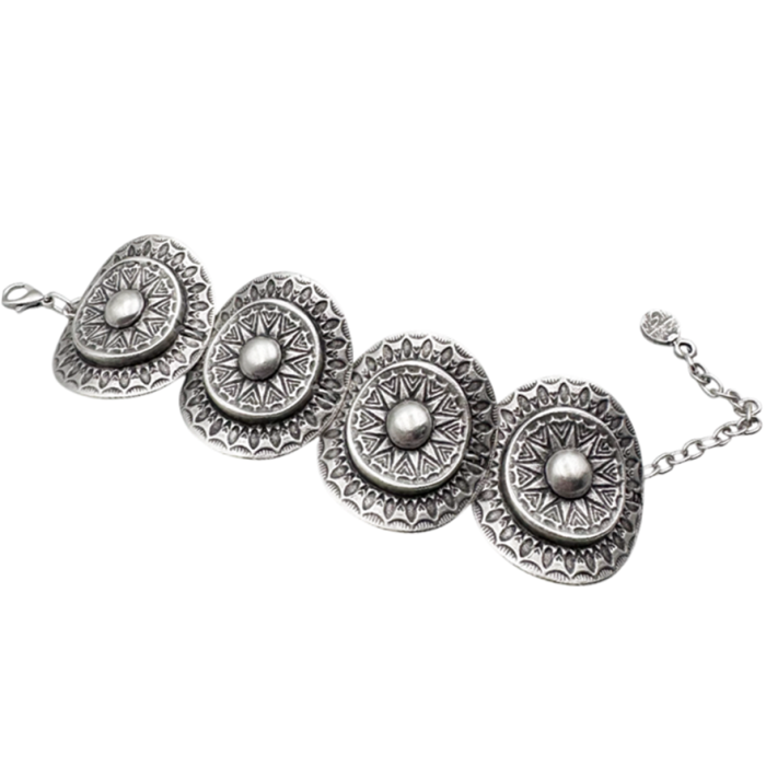 Brățară realizată din zamac, compusă din elemente rotunde cu motive solare în relief. Finisajul argintiu antichizat și designul simetric oferă un aer etnic autentic, ideal pentru ținute boeme sau statement.