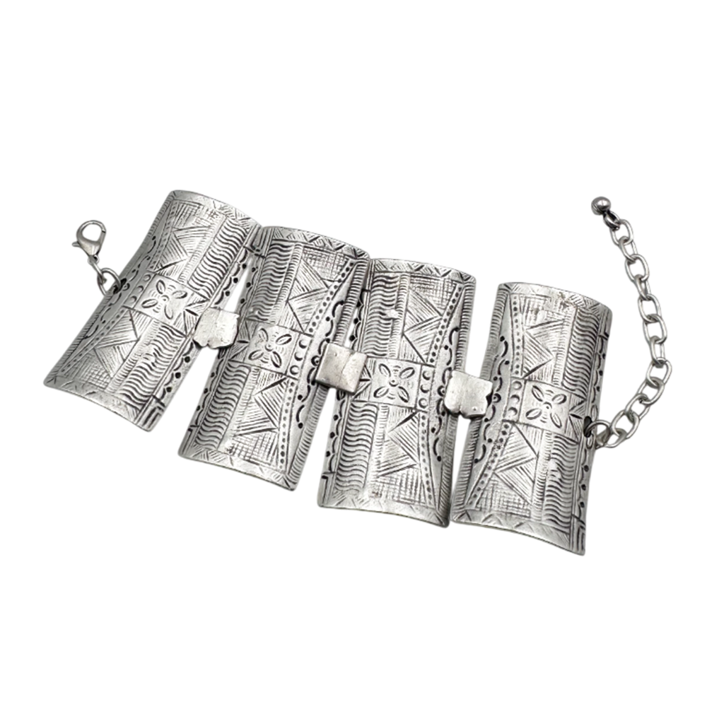 Brățară lată realizată din zamac, compusă din plăci metalice gravate cu motive geometrice și simboluri inspirate din arta tradițională. Finisajul argintiu antichizat și designul statement o recomandă ca accesoriu boem, cu personalitate, potrivit atât pentru ținute casual, cât și pentru stiluri etnice sau artistice.