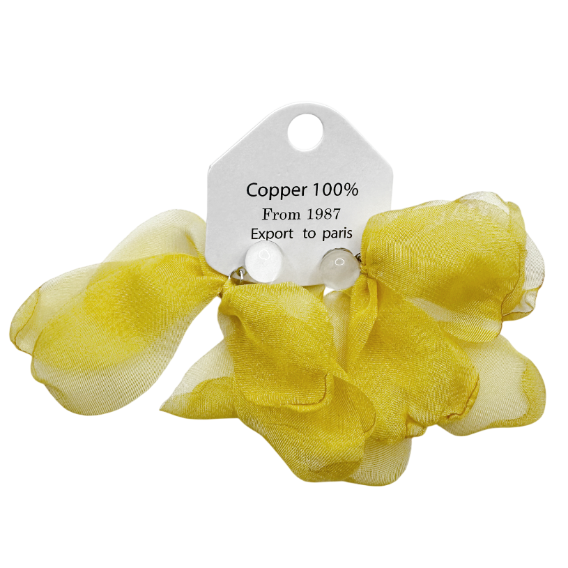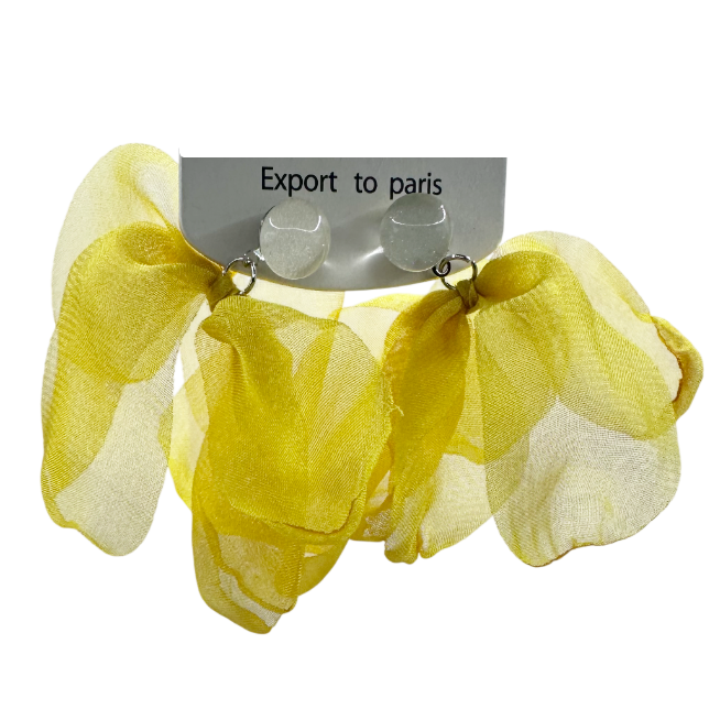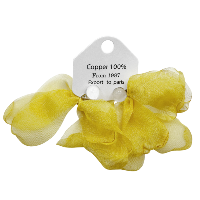 Delicați și feminini, acești cercei tip fundiță din voal adaugă un aer romantic și diafan oricărei ținute. Nuanța de galben este subtilă și elegantă, ușor de asortat atât cu outfituri deschise la culoare, cât și cu ținute minimaliste.