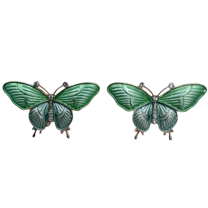Cercei în formă de fluture, realizați în nuanțe delicate de verde, cu finisaj emailat și detalii fine strălucitoare.